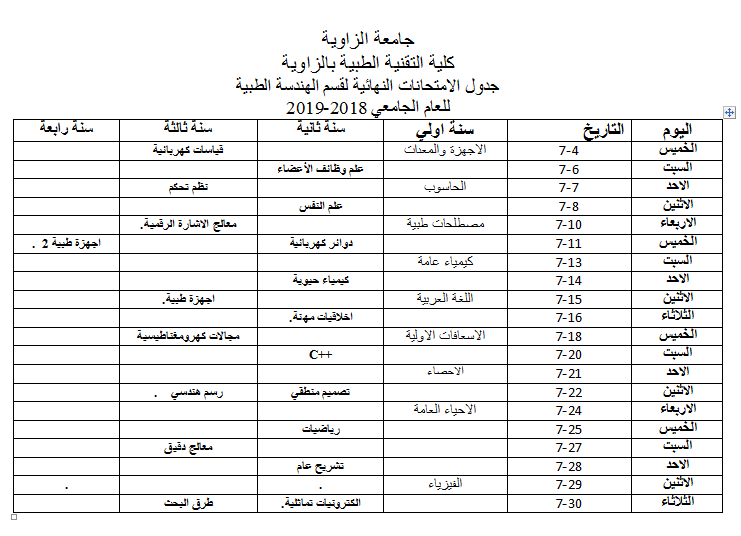 الأعزاء طلبة قسم الهندسة الطبية وقسم تقنية الأسنان بالكلية .. مرفق بهذا الإعلان صور لجداول الإمتحانات النهائية الدور الأول المعدّلة الخاصة بكم .. سائلين الله التوفيق للجميع .
