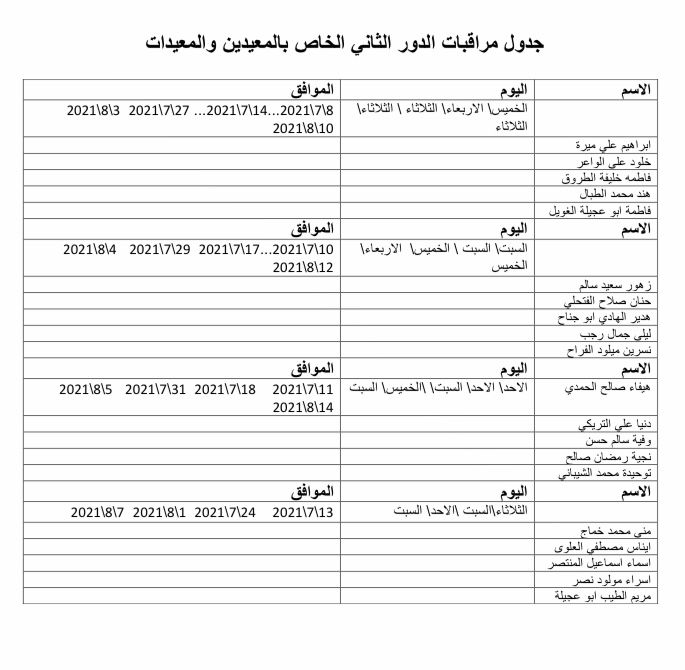 جدول مراقبات الدور الثاني الخاص بالمعيدين والمعيدات
