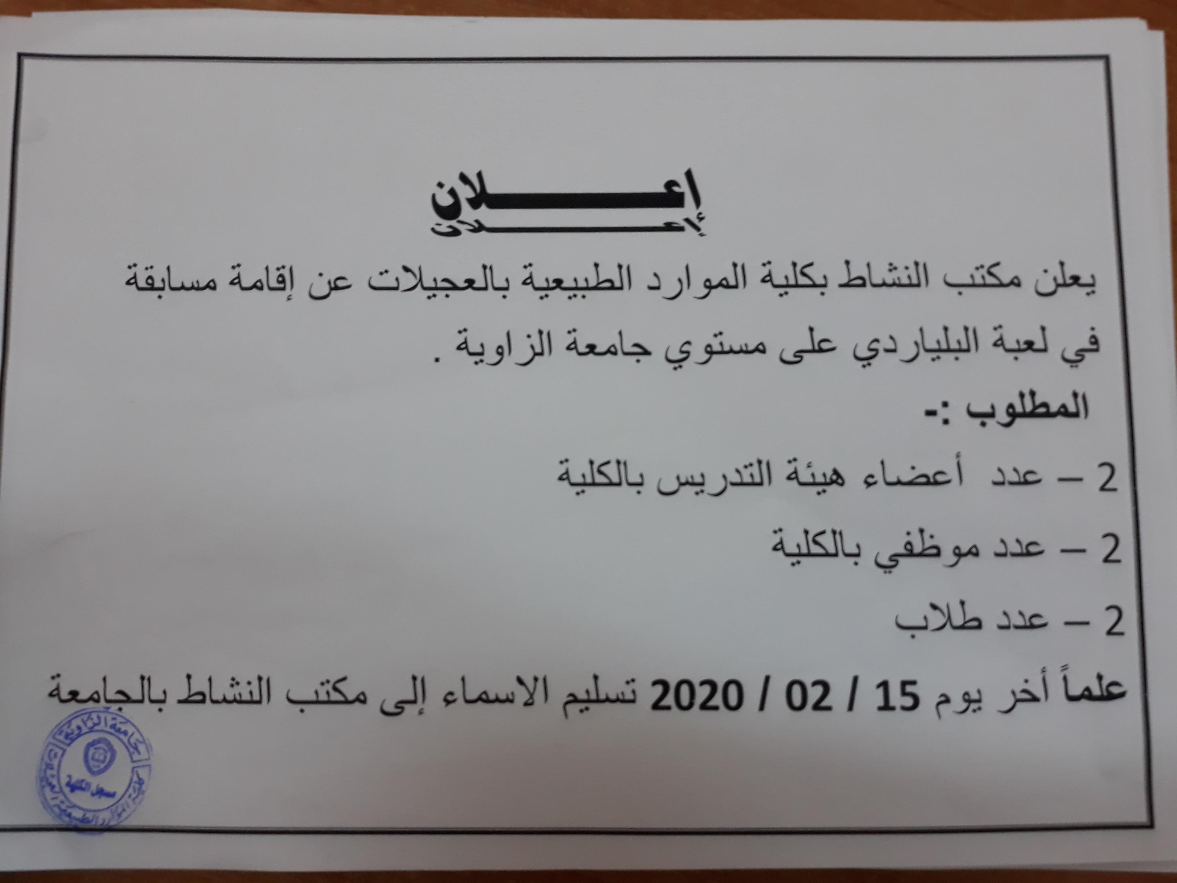 تعلن كلية هندسة الموارد الطبيعية العجيلات عن البدء في تجديد القيد للفصل الدراسي الخريف 2019/2020 لجميع الطلبة ابتداءاً من يوم الاثنين القادم 18/11/2019 الي غاية نهاية دوام يوم الخميس 21/11/2019 ولن يتم تجديد القيد لآي طالب بعد هذا الموعد