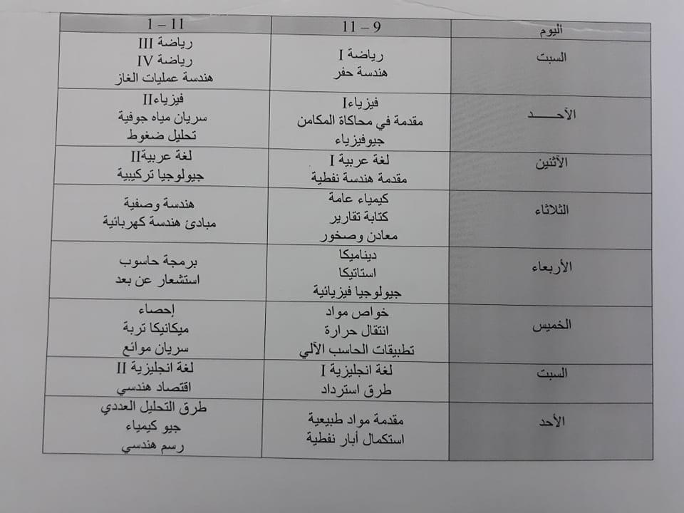 سيكون الامتحان النصفي لمقرر خواص صخور المكمن يوم الاحد 09/02/2020 الساعة 11:00